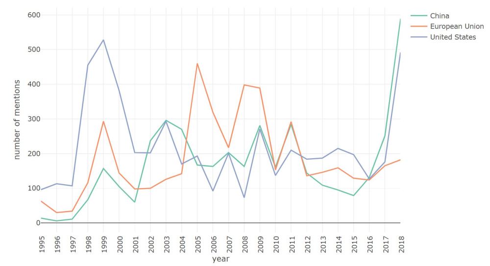 One more interesting finding: The ongoing trade conflict between the US and China and the US position on appointments for the WTO Appellate Body have propelled mentions of the two countries to new heights in 2018. Figure 3 shows the change in country mentions of the US, China and the EU over the years. As you can see, mentions of the US and China skyrocketed in 2018.