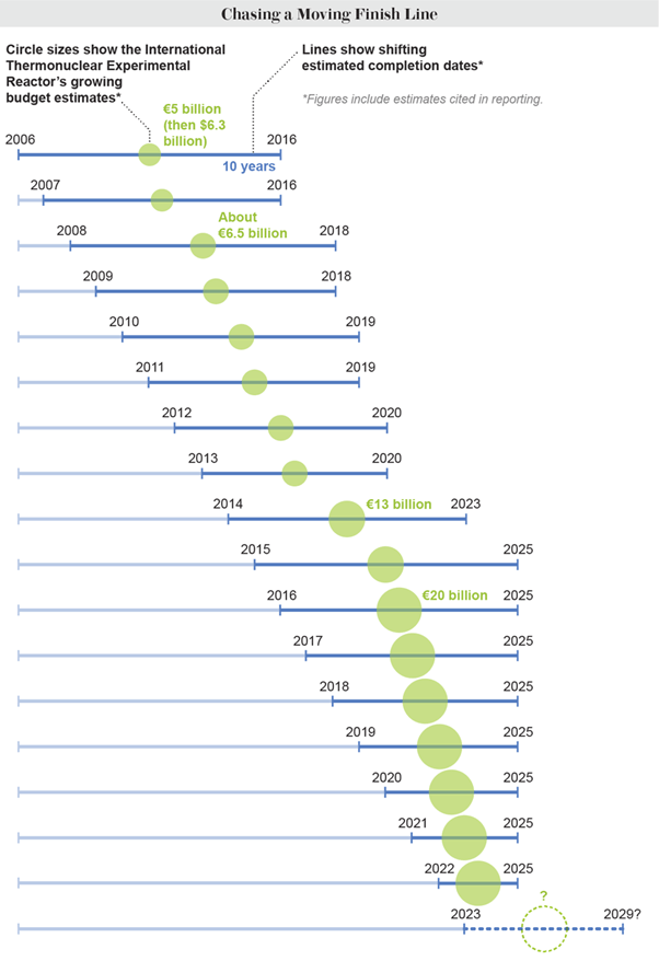 Not to pick on any particular project, but this great illustration of the travails of ITER (the International Thermonuclear Experimental Reactor in the south of France) came to mind while reading the book. It might be very silly to expect a clear delivery schedule for an international project aiming to build a small star on Earth, and construction of the giant fusion power machine has unsurprisingly been beset by delays. A recent article concludes, “ITER is on the verge of a record-setting disaster as accumulated schedule slips and budget overruns threaten to make it the most delayed—and most cost-inflated—science project in history.”