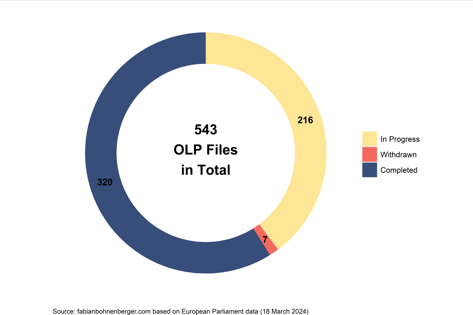 My calculation aims to include all legislative files that moved/are still moving through the so-called Ordinary Legislative Procedure (OLP). This is now the standard process to adopt new pieces of legislation. I only include files proposed in the current (9th) parliamentary term (2019-2024).