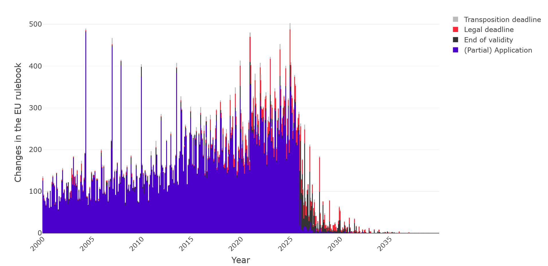 Take a look: the figure below shows the number of legal changes per month from the year 2000 to 2040. Each bar represents a month.