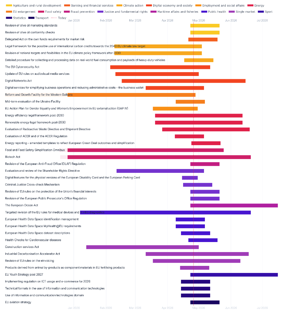 To help you stay on top of it all – and sort through the clutter – I’ve put together a full overview, including timelines, sorted by policy area, responsible Commission service and type of legal act.